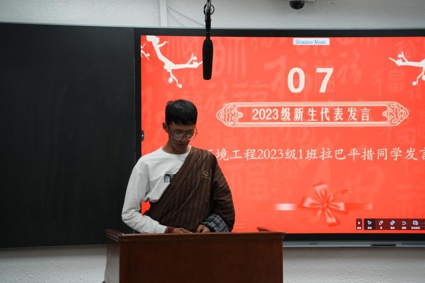 环境工程2023级1班学生拉巴平措作为新生代表发言。作为一名来自西藏牧区的学生,家里由一位伟大的母亲拉扯长大七兄弟中的“三哥”,他从小就独立放牧,热爱祖国的山山水水,一草一木。在发言中,他表达了党和国家的感激之情,并表达了对学院领导、老师、学长学姐们的感谢之情。立志要做瓜子tv