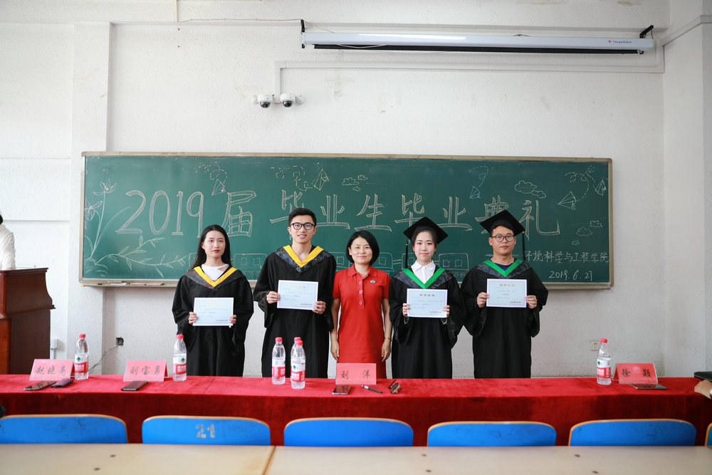 发言结束之后,在激昂的音乐声中,进行表彰仪式,学院领导和老师为毕业生颁发荣誉证书。随后学位授予仪式在有序的节奏中进行,学院领导和老师为毕业生颁发毕业证书,授予学位并拨穗正冠。现场想起一阵阵掌声。
