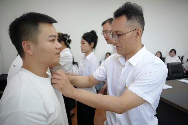 徽耀初心,使命记心间。由学院教师,党员代表为19名同学佩戴党徽,新同志们佩戴上党徽,是身份的亮明、形象的展示和义务的提醒,相信他们必将责任挺在胸前、记在心中、落实到行动上。
