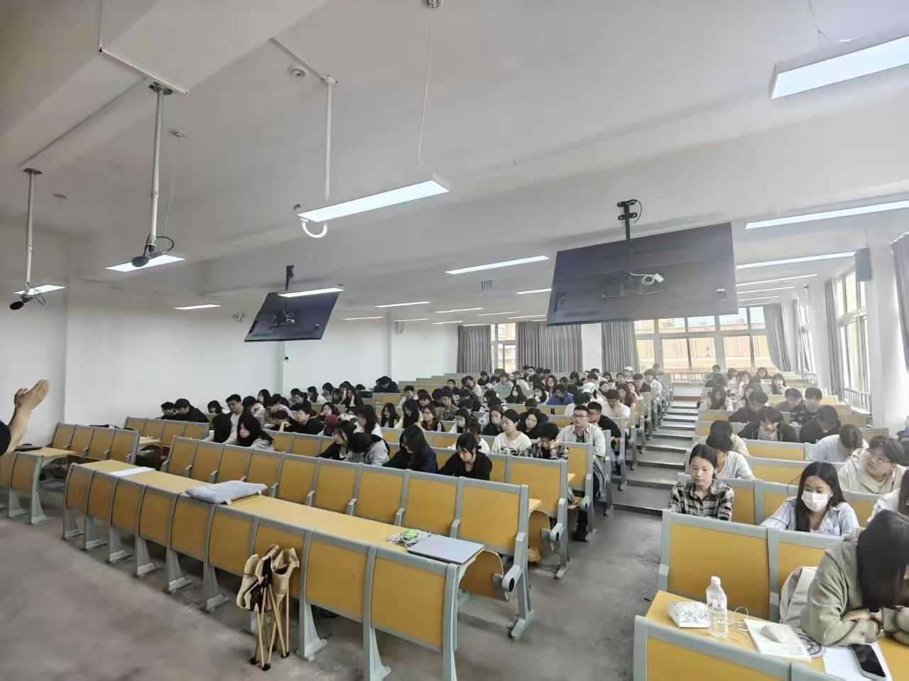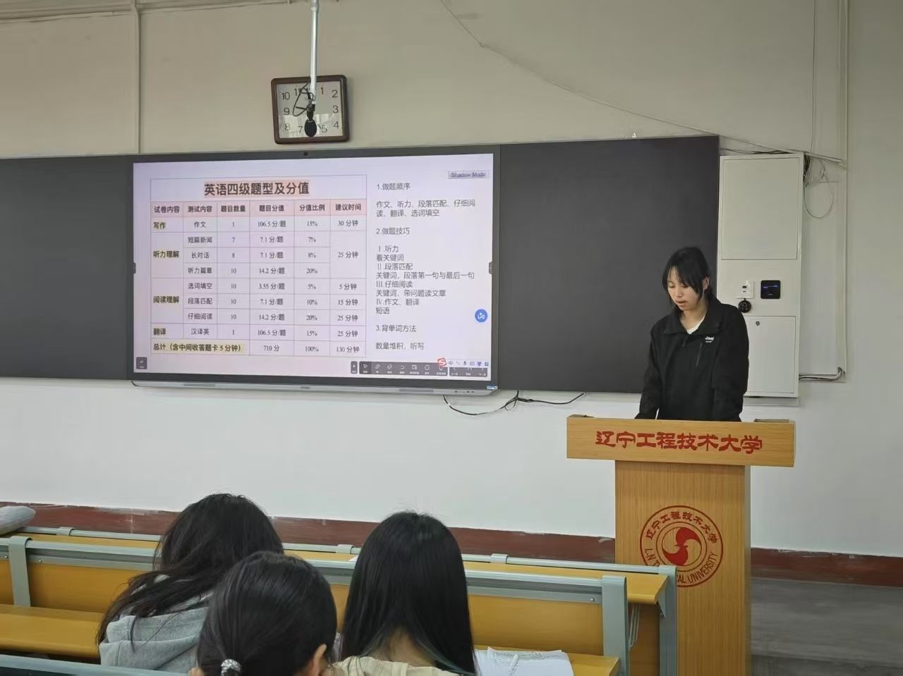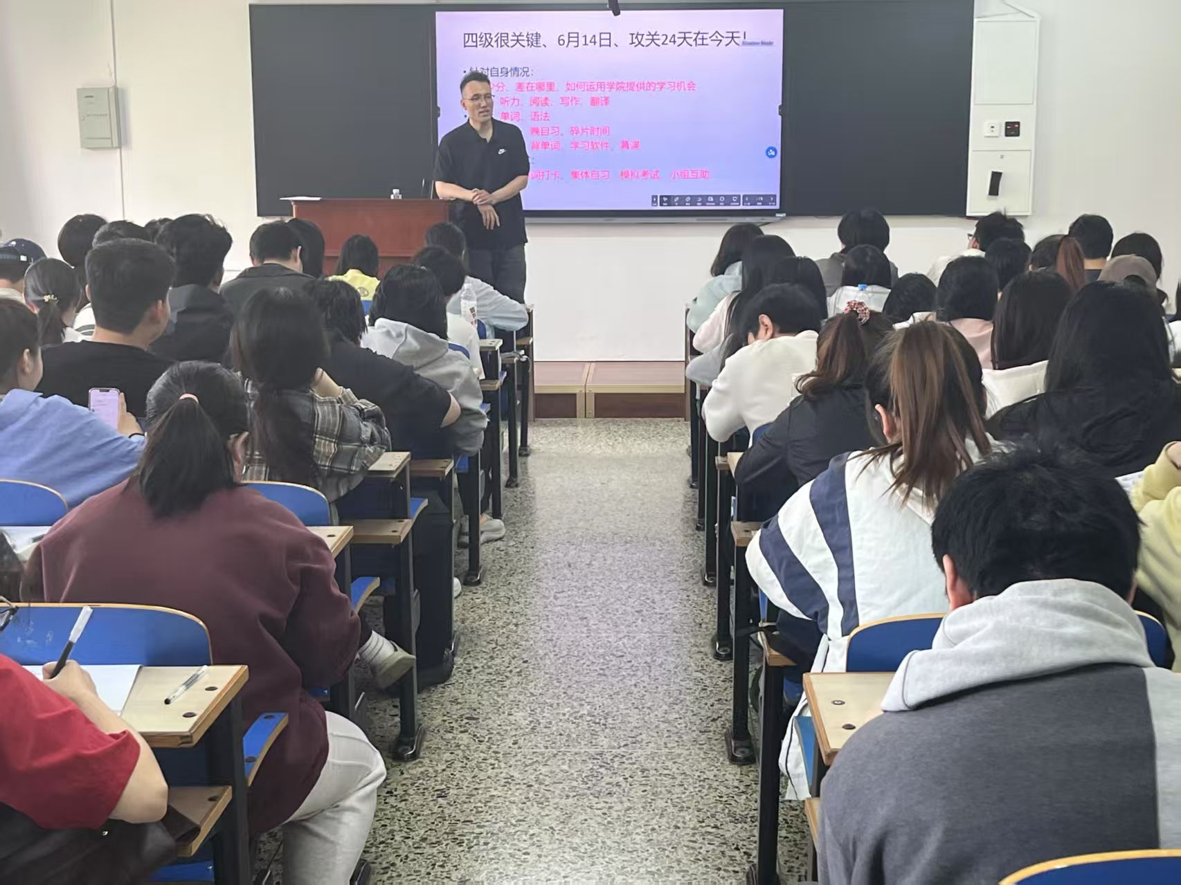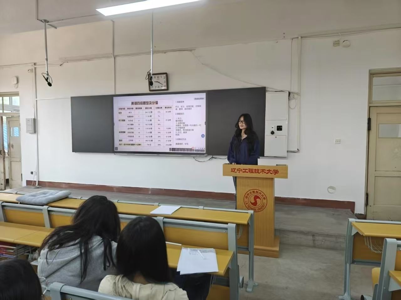 学院党委副书记蒋思围绕学生各类英语学习现状、学院开展的各类辅导活动与进展、主攻重点问题等进行讲授。环境23-1班吴佳慧、环境23-2班兰红玉等同学向同学们分享交流了通过四级、六级的经验。